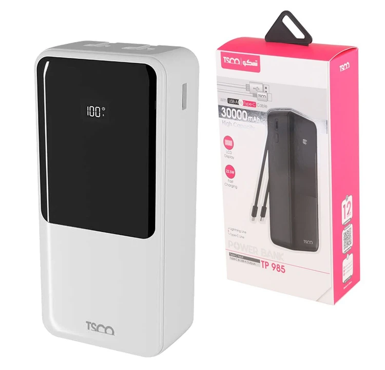یکی از برجسته‌ترین ویژگی‌های پاوربانک TP985 ظرفیت عظیم باتری آن است. با داشتن باتری 30000 میلی‌آمپرساعتی، این محصول به شما این امکان را می‌دهد که چندین مرتبه دستگاه‌های خود را بدون نگرانی از تمام شدن شارژ باتری، شارژ کنید.این پاوربانک با تکنولوژی‌هایی همچون QC2.0، QC3.0، PD، PPS و پروتکل‌های اختصاصی برندهای مطرح مانند AFC (سامسونگ)، FCP (هواوی)، و SCP هماهنگ است. این موضوع باعث می‌شود که کاربران بتوانند تمامی دستگاه‌های خود را اعم از گوشی‌های هوشمند، تبلت‌ها و حتی برخی از لپ‌تاپ‌ها را با سرعت بالا و ایمنی کامل شارژ کنند.پاوربانک تسکو TP985 مجهز به چهار نوع خروجی متفاوت است که به کاربر اجازه می‌دهد تا همزمان چند دستگاه را شارژ کند. این درگاه‌ها شامل Type-C، USB-A و کابل‌های داخلی Type-C و Lightning هستند.درگاه Type-C این پاوربانک با توان خروجی تا 20 وات، یکی از سریع‌ترین گزینه‌های موجود برای دستگاه‌های پشتیبانی‌کننده از فناوری شارژ سریع است. علاوه بر این، پاوربانک TP985 با قابلیت سوپرفست شارژ، گزینه‌ای ایده‌آل برای کاربرانی است که به سرعت شارژ دستگاه‌های خود اهمیت می‌دهند.یکی از عناصر چشمگیر این پاوربانک، صفحه‌نمایش LCD تعبیه‌شده بر روی آن است. این صفحه‌نمایش، میزان شارژ باقی‌مانده را به صورت دقیق نمایش می‌دهد.